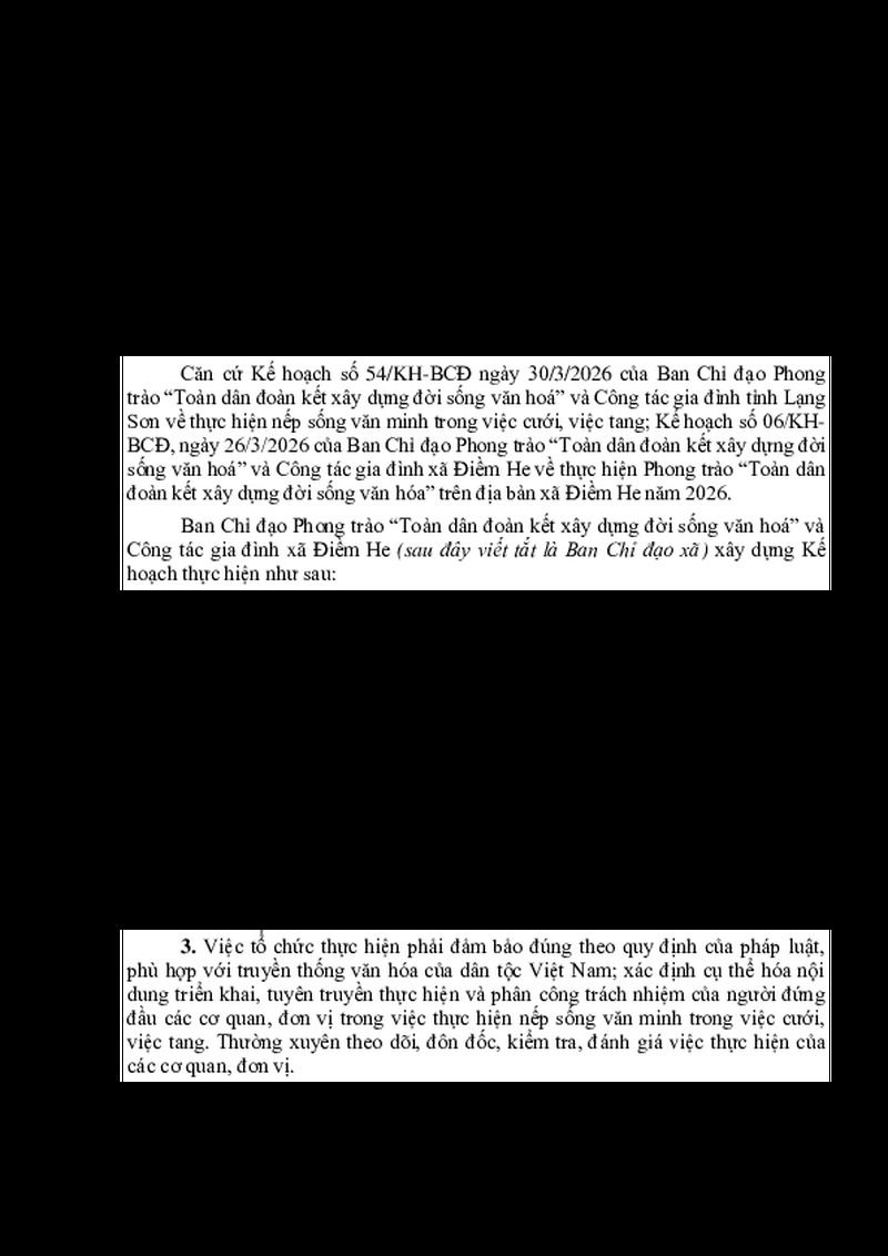 | Tiêu đề văn bản | KẾ HOẠCH Thực hiện nếp sống văn minh trong việc cưới, việc tang trên địa bàn xã Điềm He năm 2026 | ||
