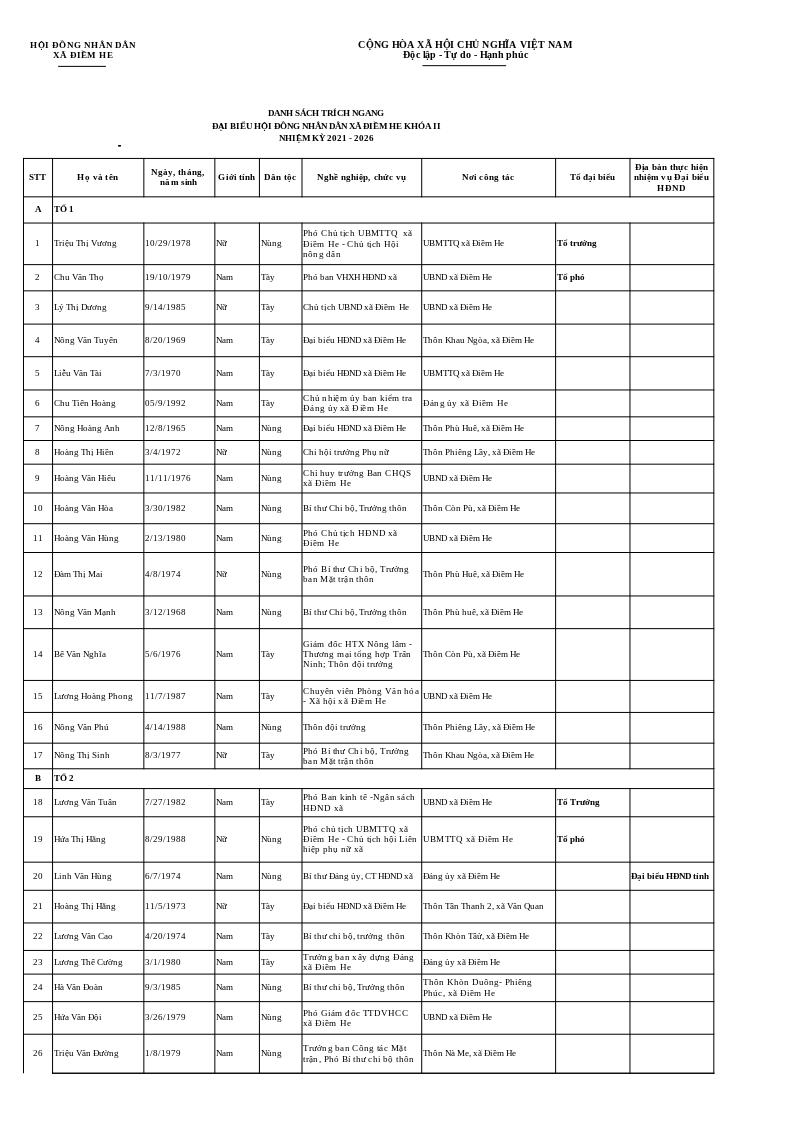 Tiêu đề văn bản | DANH SÁCH TRÍCH NGANG ĐẠI BIỂU HỘI ĐỒNG NHÂN DÂN XÃ ĐIỀM HE KHÓA II, NHIỆM KỲ 2021 - 2026 | ||