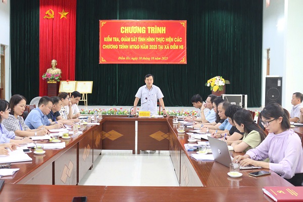 Thực hiện Thông báo số 582/TB-SNNMT ngày 08/10/2025 của Sở Nông nghiệp và Môi trường tỉnh Lạng Sơn về Chương trình kiểm tra, giám sát tình hình thực hiện các Chương trình MTQG năm 2025 tại xã Điềm He. Ngày 10/10/2025, đoàn kiểm tra, giám sát tình hình thực hiện các Chương trình MTQG năm 2025 do đồng chí Nguyễn Hữu Chiến, Giám đốc Sở Nông nghiệp và Môi trường làm trưởng đoàn tổ chức kiểm tra, giám sát tại xã Điềm He; tham gia đoàn kiểm tra còn có đại diện lãnh đạo các Sở: Tài chính; Dân tộc và Tôn giáo, Khoa học và Công nghệ, Công thương, Văn hoá, Thể thao và Du lịch, Xây dựng, Nội vụ, Y tế, Ủy ban MTTQ Việt Nam tỉnh; Các phòng, đơn vị thuộc Sở: Phát triển nông thôn, Chi cục Kiểm lâm; đại diện Ban Quản lý dự án đầu tư xây dựng tỉnh.