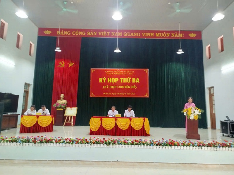 Thực hiện công văn số 1789/SNV-XDCQ, ngày 25/6/2025 của Sở Nội vụ tỉnh Lạng Sơn, về việc hướng dẫn một số nội dung liên quan khi thực hiện mô hình chính quyền địa phương 2 cấp. Ngày 28/8/2025, HĐND xã Điềm He long trọng tổ chức kỳ họp thứ 3 (kỳ họp chuyên đề) HĐND xã khóa II, nhiệm kỳ 2021-2026. Dự và chỉ đạo kỳ họp có đồng chí Linh Văn Hùng, Bí thư Đảng ủy-Chủ tịch HĐND xã Điềm He; dự kỳ họp ngày hôm nay có mặt các đồng chí trong Thường trực Đảng ủy; Thường trực HĐND xã; Lãnh đạo UBND xã; UB MTTQ Việt Nam xã; Các đại biểu HĐND xã khóa II có mặt 46/56 đại biểu.