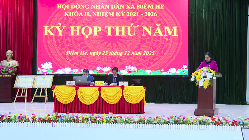 Sáng ngày 23/12/2025, tại hội trường nhà văn hóa xã Điềm He, HĐND xã Điềm He long trọng tổ chức kỳ họp thứ 5 (kỳ họp thường lệ cuối năm 2025) HĐND xã khóa II, nhiệm kỳ 2021-2026. Dự và chỉ đạo kỳ họp có đồng chí Linh Văn Hùng, Bí thư Đảng ủy-Chủ tịch HĐND xã Điềm He; dự kỳ họp ngày hôm nay có mặt các đồng chí trong Thường trực Đảng ủy; Các đồng chí Ủy viên BTV Đảng ủy; Thường trực HĐND xã; Lãnh đạo UBND xã; UB MTTQ Việt Nam xã và các tổ chức chính trị - xã hội xã; Các vị đại biểu HĐND xã khóa II có mặt 46/56 đại biểu; Thủ trưởng các cơ quan chuyên môn, đơn vị sự nghiệp thuộc UBND xã; Các đồng chí Bí thư Chi bộ, Trưởng các thôn trên địa bàn xã.