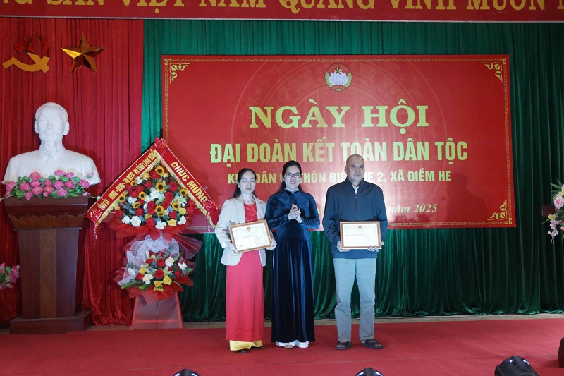 Cũng tại ngày hội, lãnh đạo UBND xã trao tặng danh hiệu “Thôn văn hóa” và “Gia đình văn hóa” tiêu biểu năm 2025 cho các hộ dân thôn Điềm He 2.