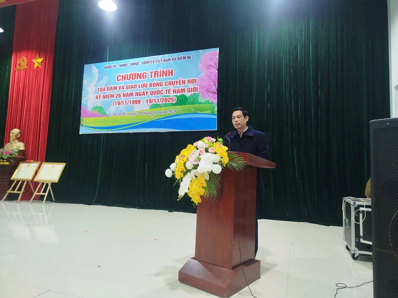 Ngày 19/11/2025 tại nhà văn hóa xã Điềm He. Đảng ủy, HĐND, UBND, UBMTTQ xã Điềm He tổ chức buổi tọa đàm nhân kỷ niệm 26 năm ngày Quốc tế nam giới (19/11/1999 – 19/11/2025). Dự buổi tọa đàm có các đồng chí lãnh đạo Đảng ủy, HĐND, UBND, UBMTTQ và toàn thể CB CC xã. Tại buổi tọa đàm các đại biểu đã được nghe ôn lại truyền thống ngày Quốc tế nam giới 19/11/1999. Nhân buổi tọa đàm, lãnh đạo Đảng ủy, HĐND, UBND, UBMTTQ tổ chức tặng quà và gửi những lời chúc mừng tốt đẹp nhất nhân ngày Quốc tế nam giới.