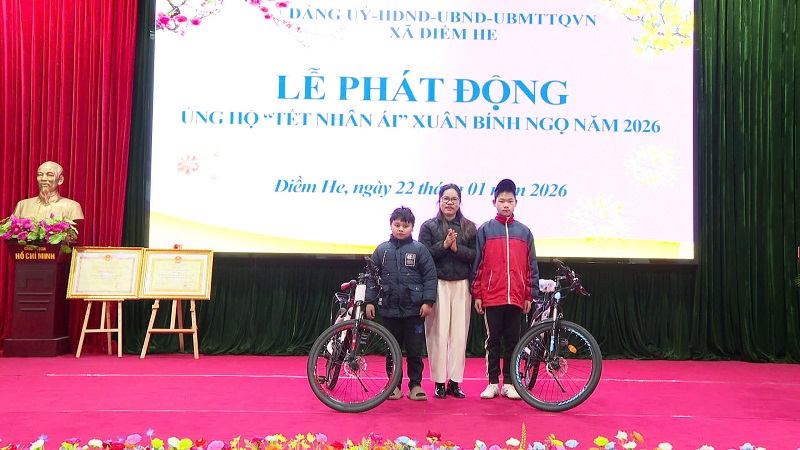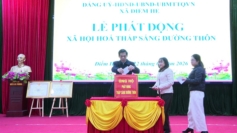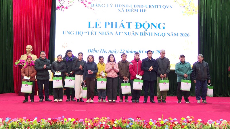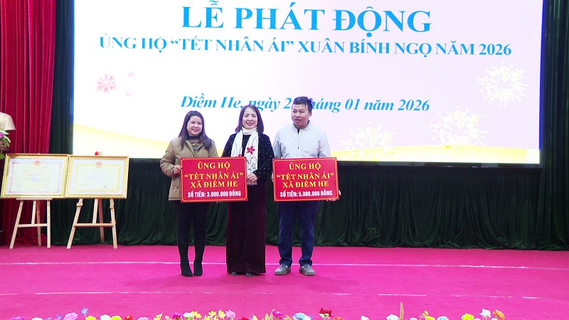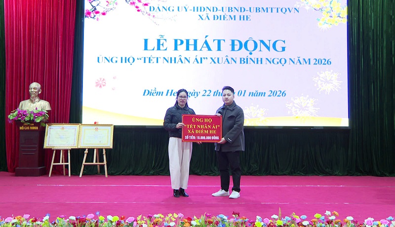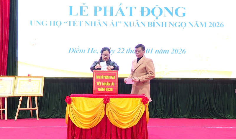 Sáng ngày 22 tháng 01 năm 2026, tại nhà văn hóa xã, Đảng ủy, HĐND, UBND, UBMTTQ Việt Nam xã Điềm he tổ chức phát động ủng hộ phong trào “Tết Nhân ái” Xuân Bính Ngọ năm 2026 và phát động xã hội hóa thắp sáng đường thôn. Dự buổi phát động có đồng chí Linh Văn Hùng, Bí thư Đảng ủy – Chủ tịch HĐND xã; đồng chí Lương Thùy Nha, Phó Bí thư Thường trực Đảng ủy; đồng chí Lý Thị Dương, Phó Bí thư Đảng ủy - Chủ tịch UBND xã; dự hội nghị có các đồng chí lãnh đạo Ban xây dựng đảng; Ủy ban kiểm tra; Văn phòng Đảng uỷ; Thường trực HĐND, UBND, Uỷ ban MTTQVN xã; lãnh đạo, chuyên viên các tổ chức chính trị xã hội; lãnh đạo, chuyên viên các phòng chuyên môn thuộc UBND xã; lãnh đạo Công an xã, Ban chỉ huy Quân sự xã; Lãnh đạo, viên chức các đơn vị: Trung tâm Dịch vụ công ích, Trạm Y tế xã; Đại diện lãnh đạo các trường học đóng trên địa bàn xã; Bí thư Chi bộ, Trưởng thôn, Trưởng ban công tác Mặt trận các thôn trên địa bàn xã và các doanh nghiệp, nhà hảo tâm trong và ngoài xã Điềm He.
