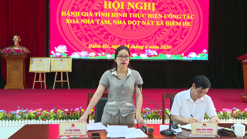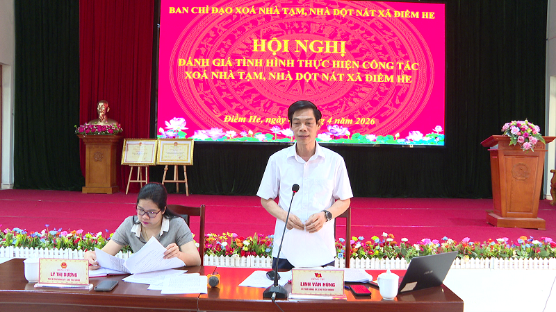 Ngày 08/4/2026, tại hội trường nhà văn hóa xã, Ban chỉ đạo xóa nhà tạm, nhà dột nát xã Điềm He tổ chức Hội nghị đánh giá tình hình thực hiện công tác xóa nhà tạm, nhà dột nát. Dự và chủ trì hội nghị đồng chí Linh Văn Hùng, Bí thư Đảng ủy – Chủ tịch HĐND xã; đồng chủ trì hội nghị; đồng chí Lý Thị Dương, Phó Bí thư - Chủ tịch UBND xã; dự hội nghị còn có các đồng chí lãnh đạo Ban xây dựng đảng, Ủy ban kiểm tra, Văn phòng Đảng ủy; Thường trực HĐND, UBND, Uỷ ban MTTQVN xã, các tổ chức chính trị xã hội; Các đồng chí thành viên tổ rà soát và các đồng chí bí thư chi bộ - trưởng thôn trên địa bàn.