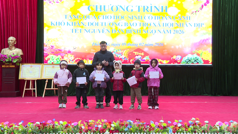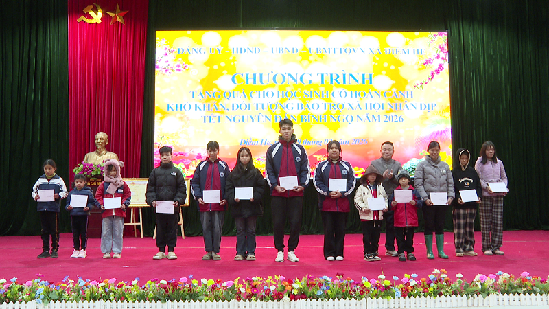 Cũng tại chương trình Đảng ủy, HĐND, UBND, UBMTTQ Việt Nam xã Điềm He tặng 40 suất quà, mỗi suất trị giá 600.000 đ cho học sinh có hoàn cảnh khó khăn, đối tượng bảo trợ xã hội nhân dịp tết Nguyên đán Bính Ngọ năm 2026.