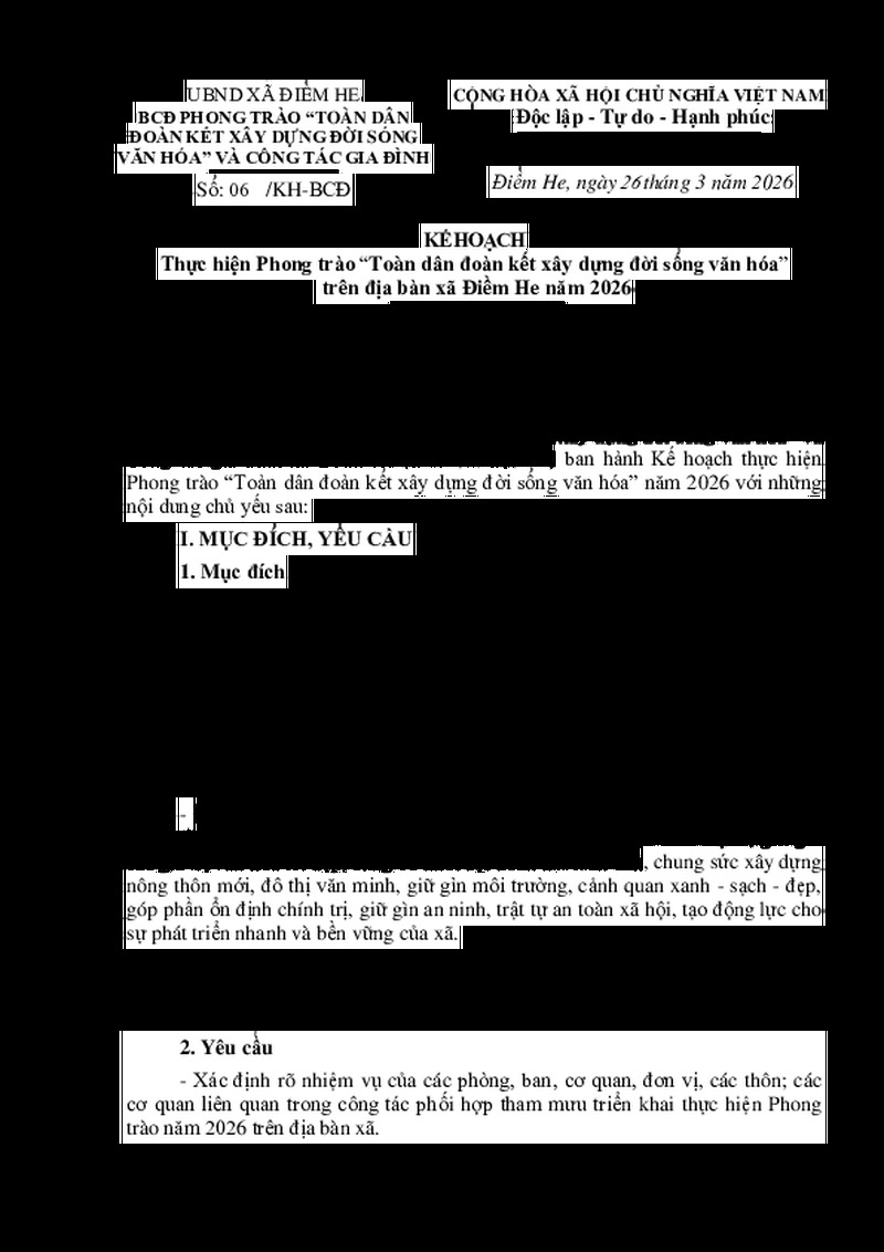 | Tiêu đề văn bản | KẾ HOẠCH Thực hiện Phong trào “Toàn dân đoàn kết xây dựng đời sống văn hóa” trên địa bàn xã Điềm He năm 2026 | ||