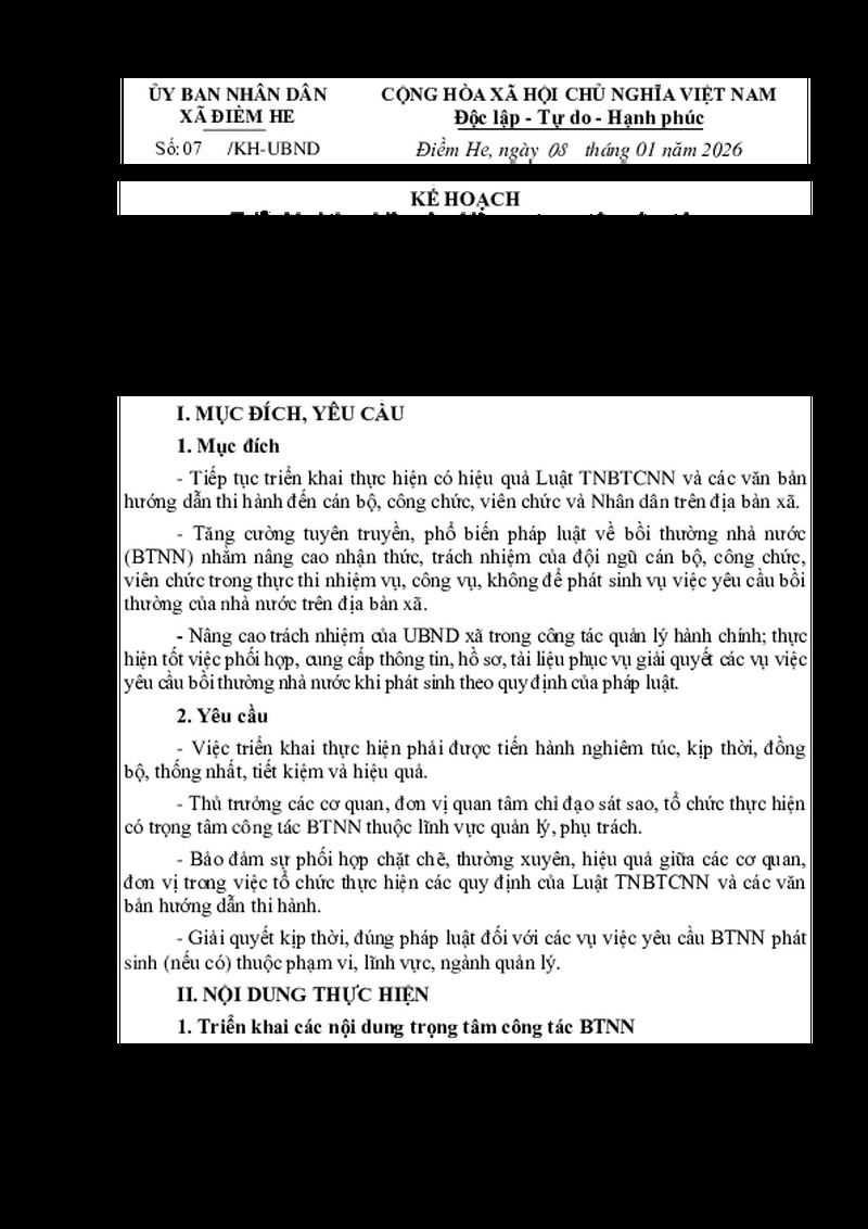 | Tiêu đề văn bản | KẾ HOẠCH Triển khai thực hiện các nhiệm vụ trọng tâm công tác bồi thường nhà nước trên địa bàn xã Điềm He năm 2026 | ||