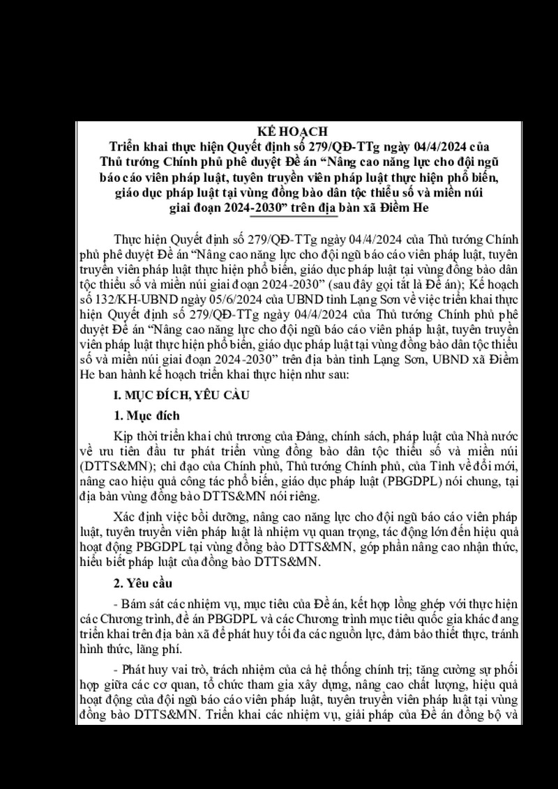 | Tiêu đề văn bản | KẾ HOẠCH Triển khai thực hiện Quyết định số 279/QĐ-TTg ngày 04/4/2024 phê duyệt Đề án “Nâng cao năng lực cho đội ngũ báo cáo viên pháp luật, TTVPL thực hiện PB GDPL tại vùng đồng bào DTTS&MN giai đoạn 2024-2030” trên địa bàn xã | ||
