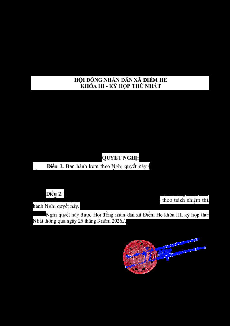 | Tiêu đề văn bản | NGHỊ QUYẾT Ban hành Quy chế làm việc của Hội đồng nhân dân, Thường trực Hội đồng nhân dân, các Ban của Hội đồng nhân dân, Tổ đại biểu và đại biểu Hội đồng nhân dân xã Điềm He khóa III, nhiệm kỳ 2026 - 2031 | ||