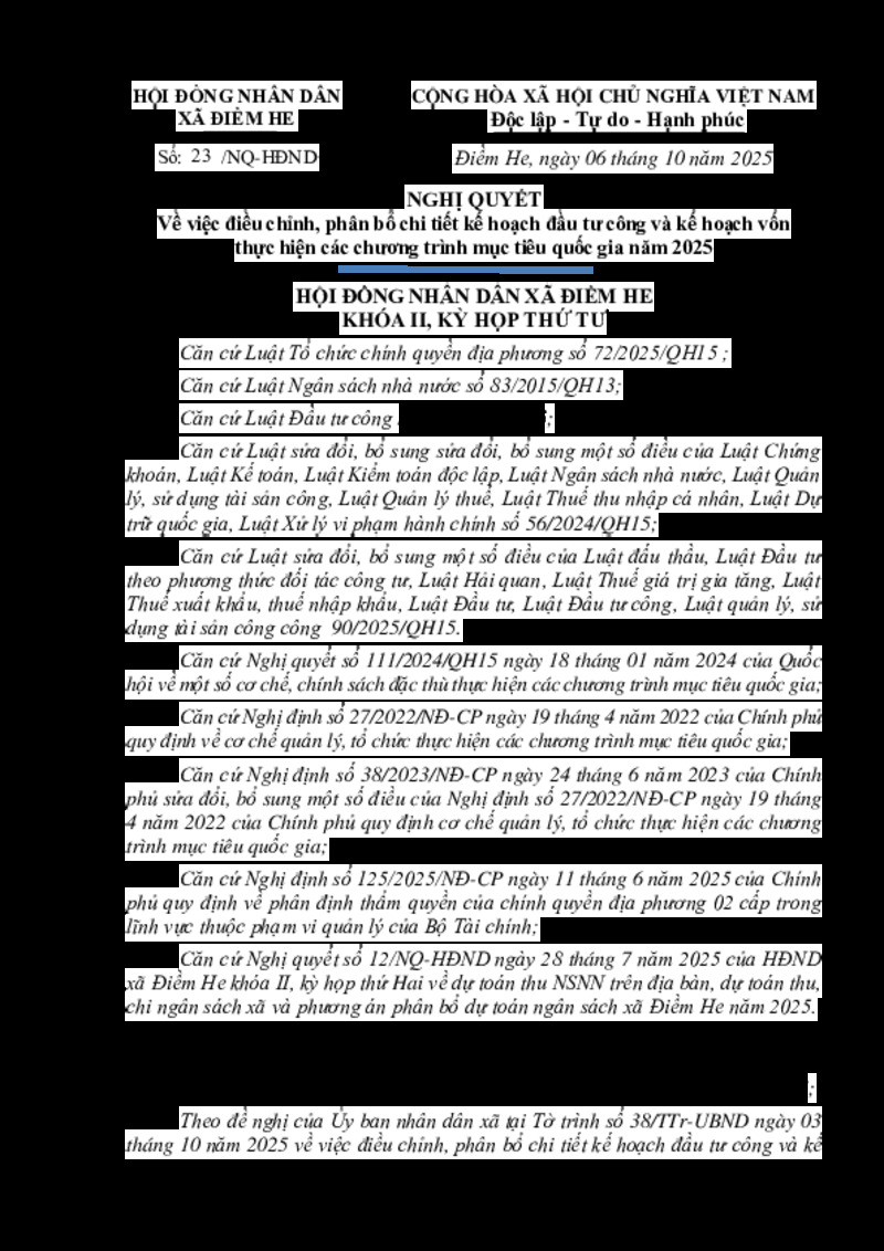 | Tiêu đề văn bản | Nghị quyết điều chỉnh, phân bổ chi tiết kế hoạch đầu tư công và kế hoạch vốn thực hiện các chương trình mục tiêu quốc gia năm 2025 | ||