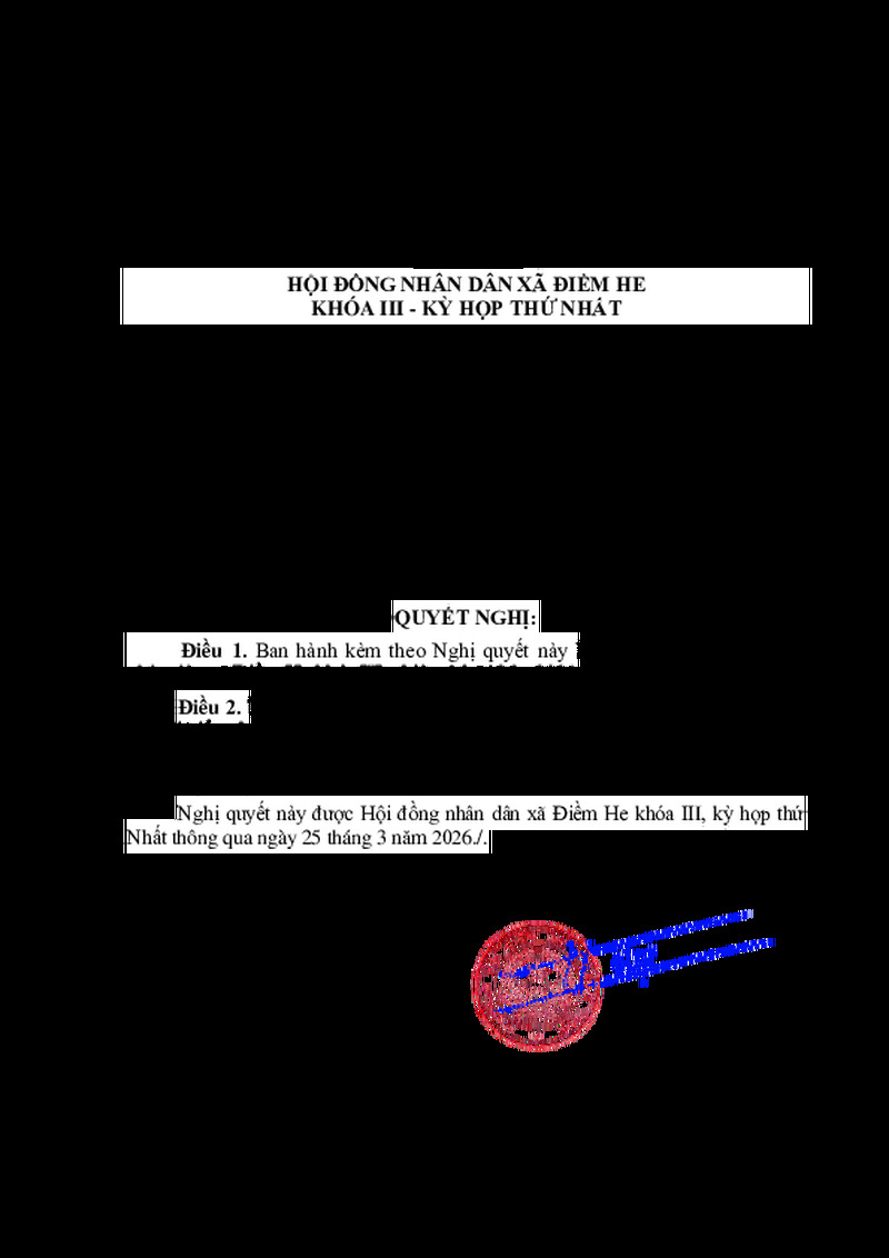 | Tiêu đề văn bản | NGHỊ QUYẾT Về việc ban hành Nội quy kỳ họp Hội đồng nhân dân xã Điềm He khóa III, nhiệm kỳ 2026 - 2031 | ||