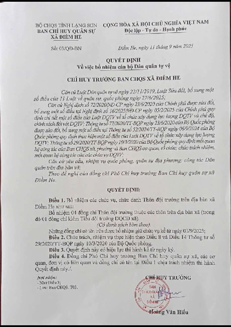 | Tiêu đề văn bản | Quyết định bổ nhiệm cán bộ dân quân tự vệ | ||