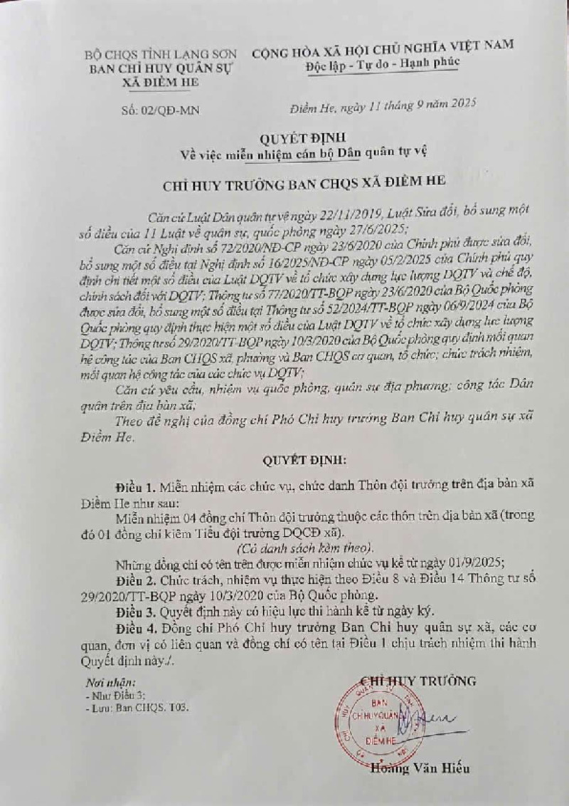 | Tiêu đề văn bản | Quyết định miễn nhiệm cán bộ dân quân tự vệ | ||