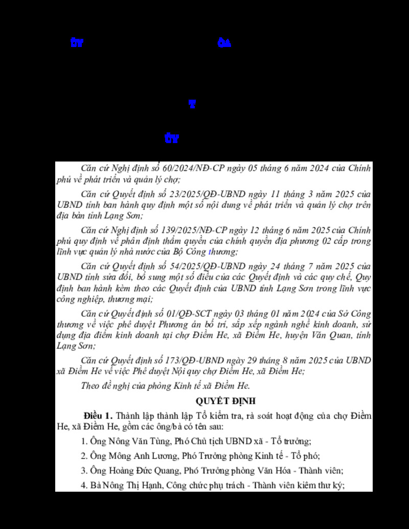 | Tiêu đề văn bản | Quyết định thành lập Tổ kiểm tra, rà soát hoạt động của chợ Điềm He, xã Điềm He | ||