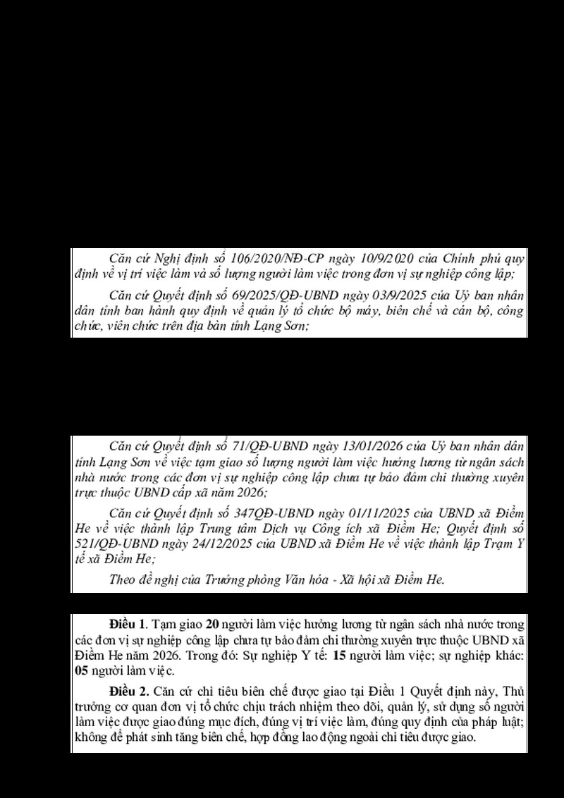 | Tiêu đề văn bản | QUYẾT ĐỊNH Về việc tạm giao số lượng người làm việc hưởng lương từ ngân sách nhà nước trong các đơn vị sự nghiệp công lập chưa tự bảo đảm chi thường xuyên trực thuộc UBND xã Điềm He năm 2026 | ||