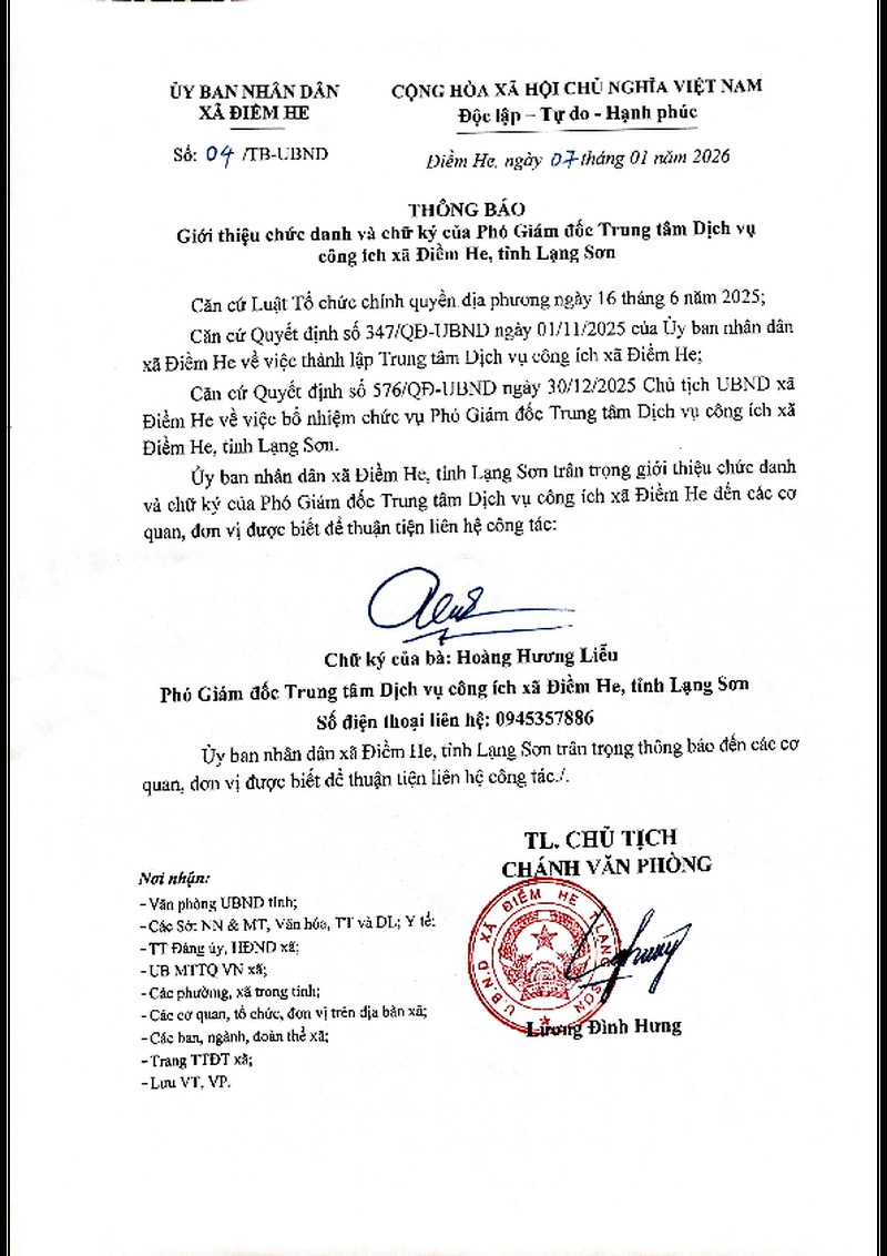 | Tiêu đề văn bản | Thông báo giới thiệu chức danh và chữ ký của Phó Giám đốc trung tâm dịch vụ công ích xã Điềm He | ||