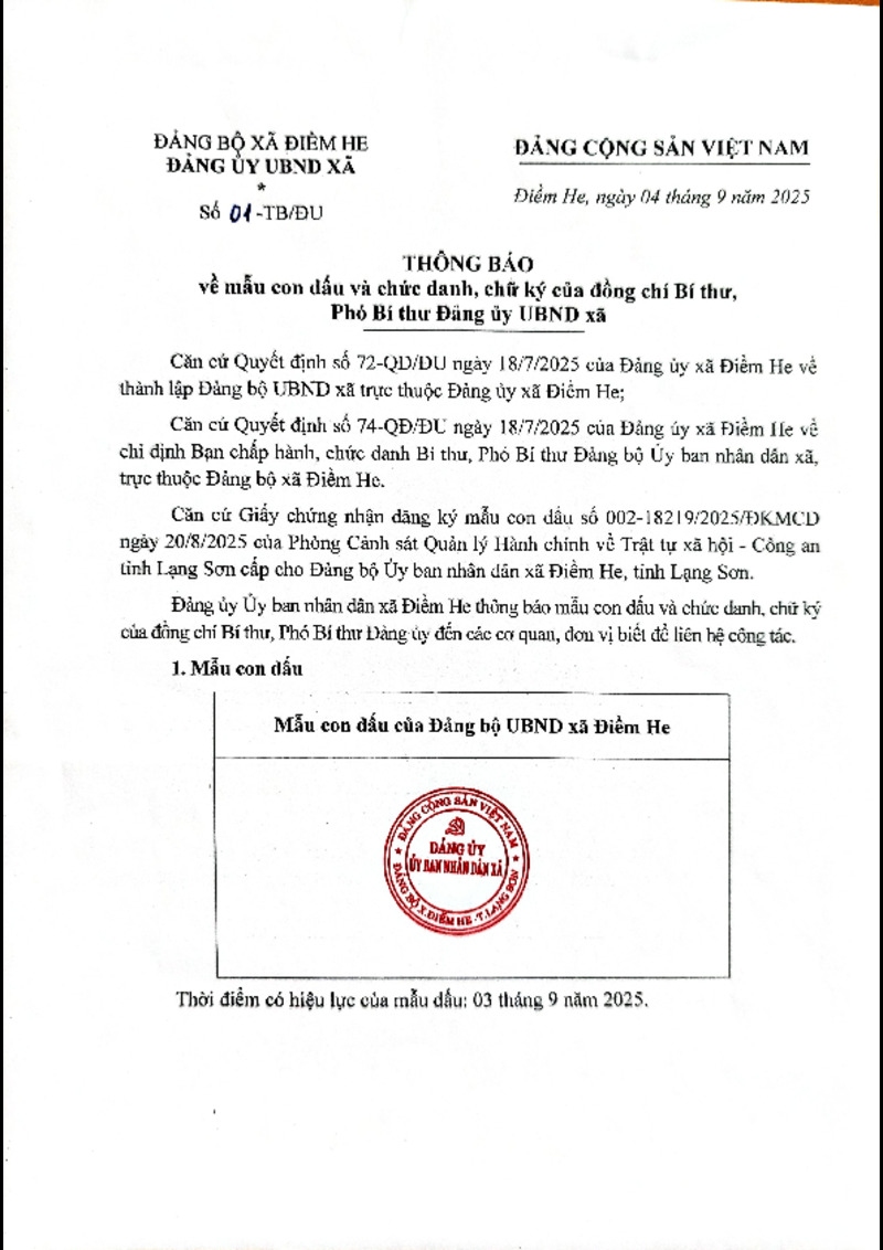 | Số hiệu | 01-TB/ĐU | Cơ quan ban hành | |